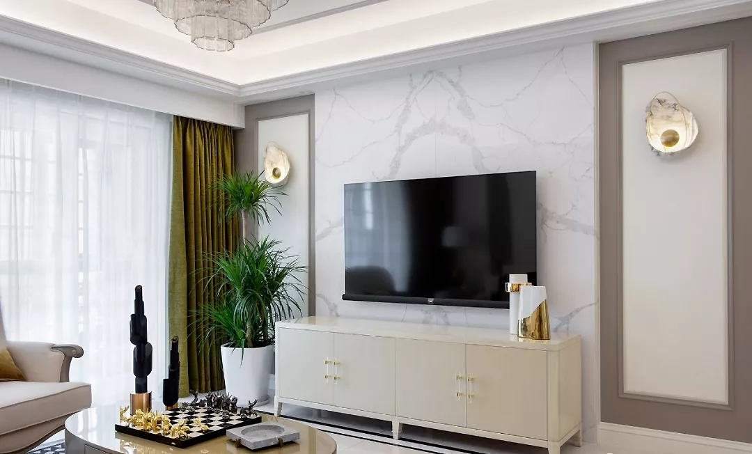 电视背景墙两侧采用了对称式设计,大理石自然纹理的融入流畅而富有艺术感。灰白基调加以灯光的氛围烘托,简单中透着温柔细腻的质感。