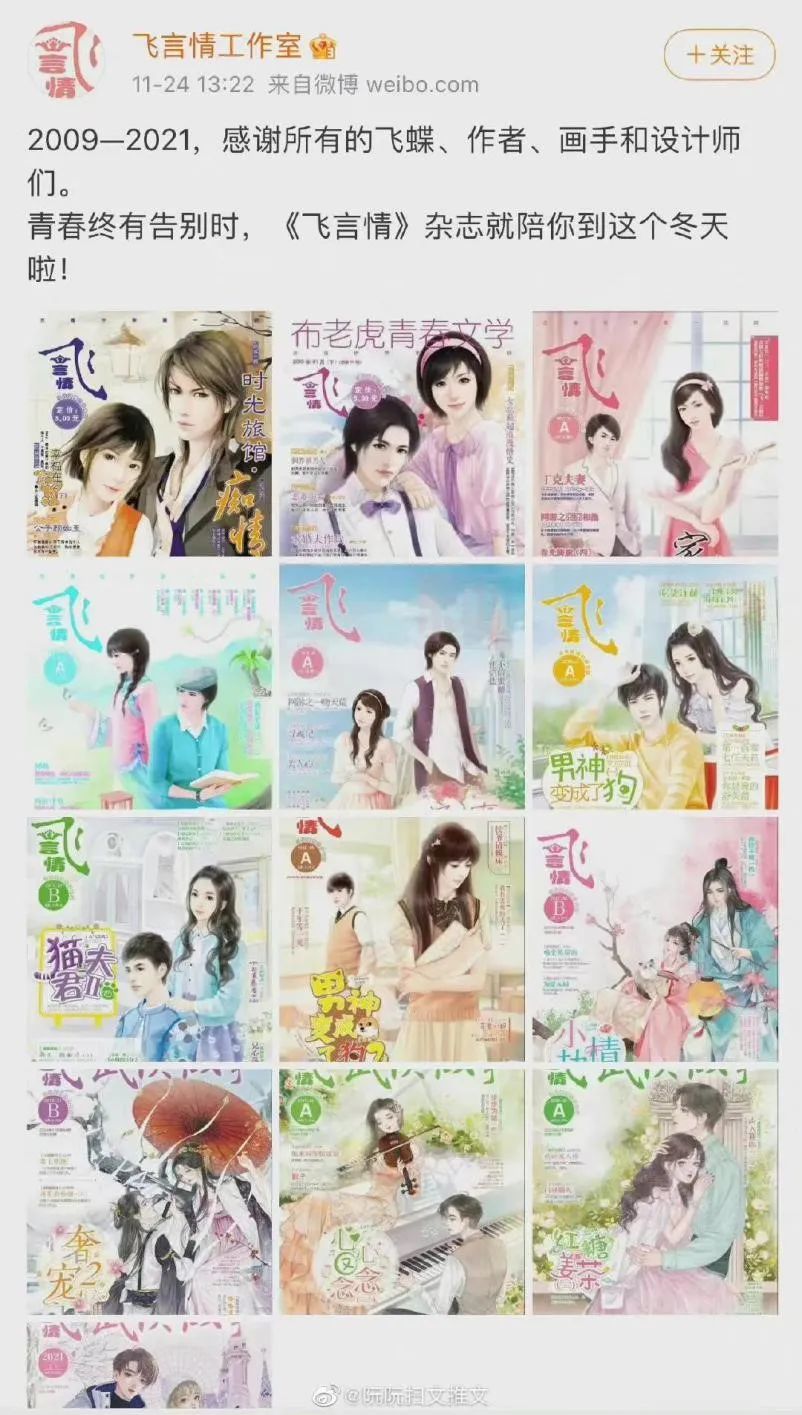 2021年,国内疫情在好转,但纸媒的冬天已经不会结束了。11月16日,《桃之夭夭》宣布休刊。11月24日,《飞言情》在微博上发文,语气仍然轻松:“青春终有告别时,《飞言情》杂志就陪你到这个冬天啦!”