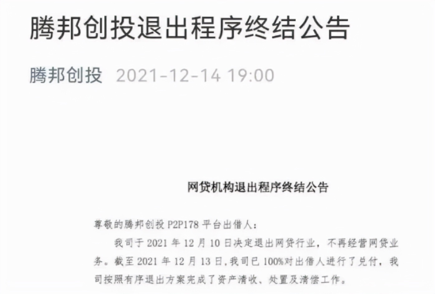 例如,2020年4月17日,随手记(运营公司深圳市随手科技有限公司)宣告退出网贷业务,2020年6月10日进行首期兑付,2021年5月20日,随手记宣布,完成本金的全部兑付工作。今年12月14日,*ST腾邦旗下P2P平台腾邦创投官方微信公众号发布公告称,公司于今年12月10日决定退出网贷行业,不再经营网贷业务。截至2021年12月13日,公司已100%对出借人进行了兑付,按照有序退出方案完成了资产清收、处置及清偿工作。