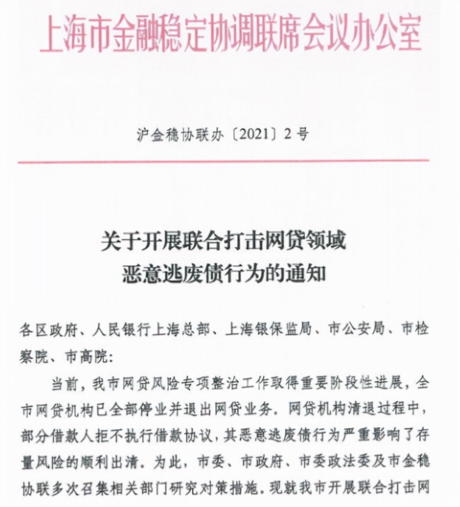 2021年2月,上海市金融稳定协调联席会议办公室下发《关于开展联合打击网贷领域恶意逃废债行为的通知》,提出将依法合规引导网贷机构开展自主催收;规范有序开展失信借款人征信工作;协同联动加大对失信借款人惩戒力度等。