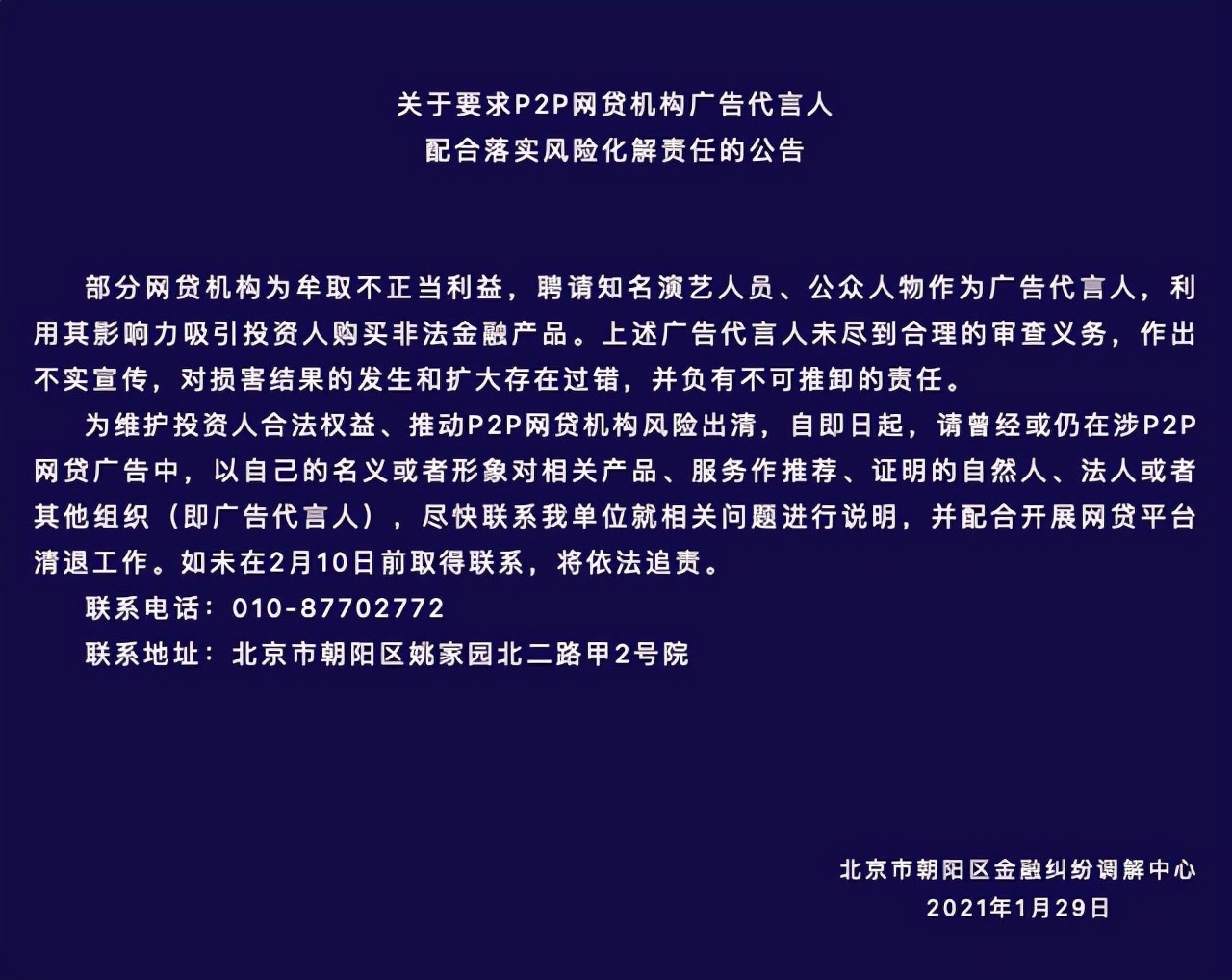 2021年1月,北京市朝阳区金融纠纷调解中心发布公告称,部分网贷机构为牟取不正当利益,聘请知名演艺人员、公众人物作为广告代言人,利用其影响力吸引投资人购买非法金融产品。上述广告代言人未尽到合理的审查义务,作出不实宣传,对损害结果的发生和扩大存在过错,并负有不可推卸的责任。