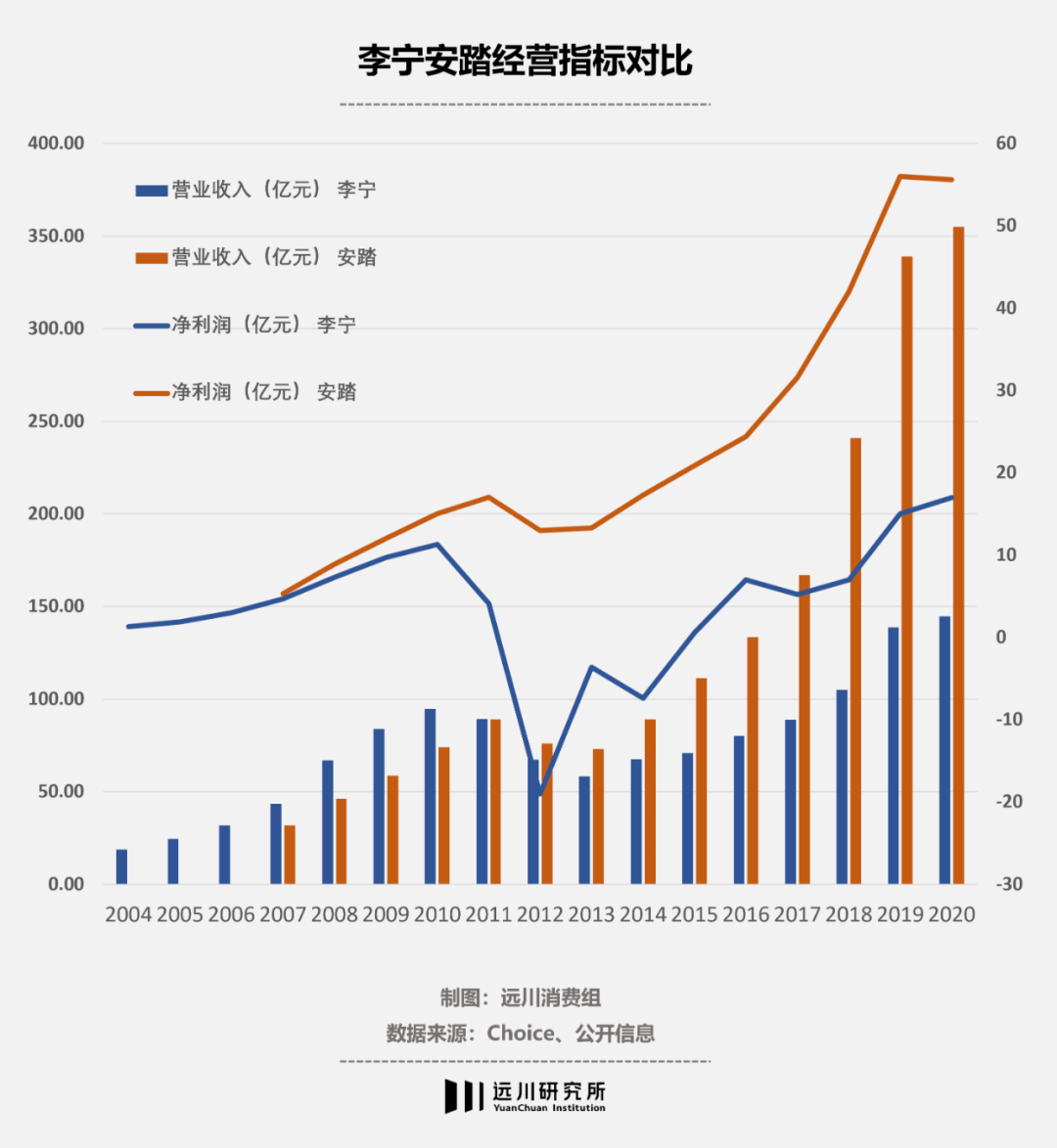 虽然此时的李宁已经意识到了问题所在,但时间并不站在他们一边。2011年,李宁最后一次以领先者的角色审视安踏,但两者的距离已经非常接近。一年后,安踏的营收第一次超过了李宁,并且差距在之后几年中越来越大。