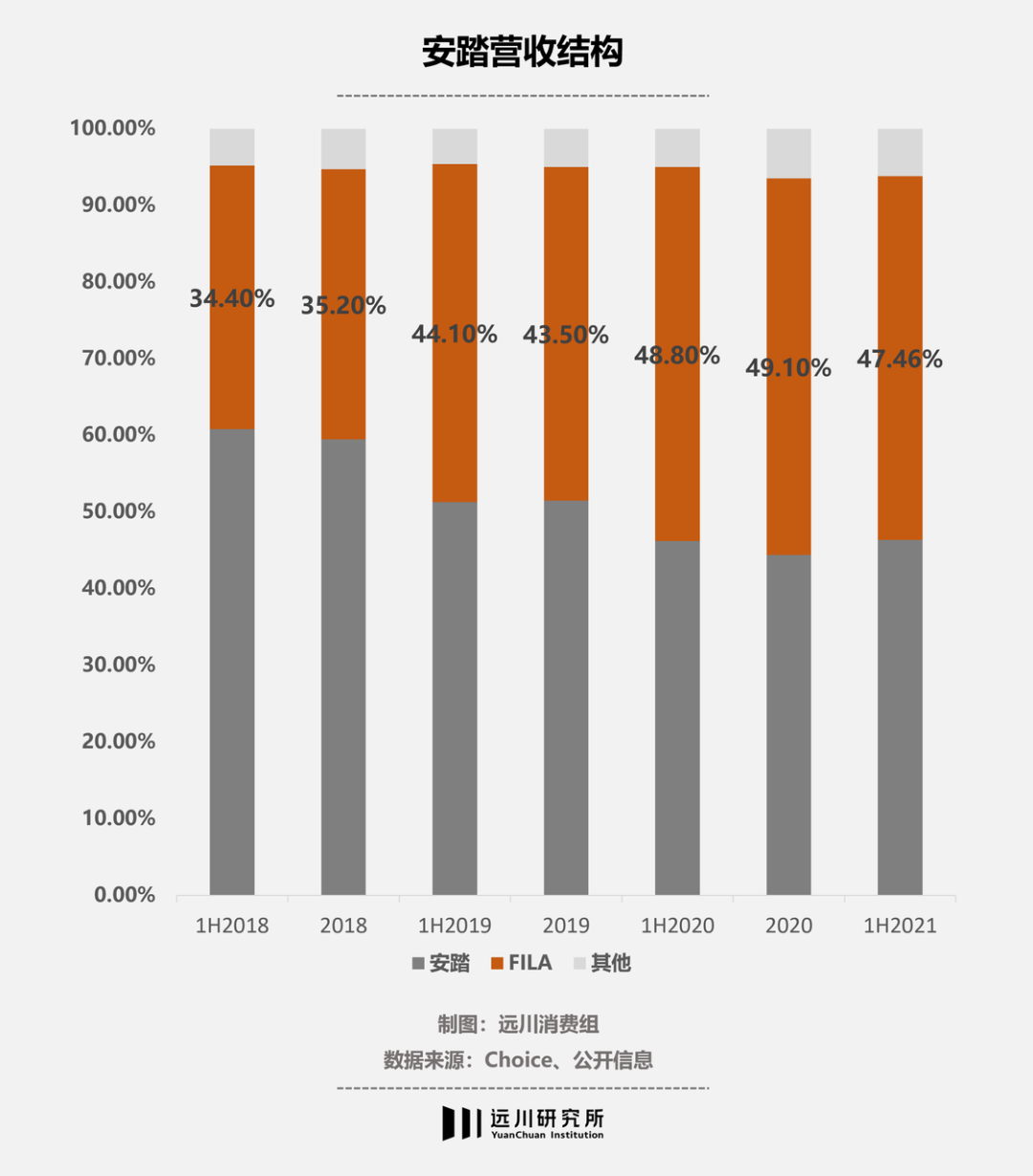 2020年,FILA首次超越了安踏主品牌营收。相比主品牌50%左右的毛利率,FILA的毛利率一直超过70%。