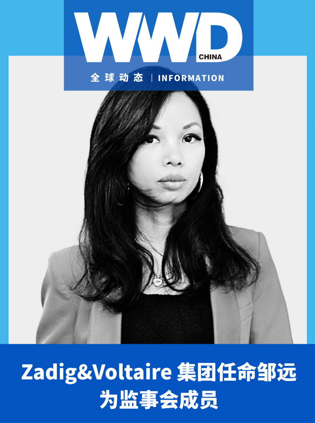 12 月 22 日, Zadig&Voltaire 集团全球总裁 Rémy Baume ,于巴黎宣布任命邹远为公司监事会成员。集团将借助邹远对在中国市场做数字营销战略思路,对 Z 世代消费者的深度了解,结合她在时尚行业的丰富经验,进一步部署其在中国市场发展策略,加强利用本土化数字营销,从而显著提高品牌在中国的知名度和影响力。邹远有着十多年在中国市场经营数字营销的经验,与全球知名奢侈品、时尚品牌有过长期密切的合作。她来自管理咨询行业,曾在美国和英国四大管理咨询公司任高管职位,拥有丰富的跨国管理阅历。此项任命体现了集团对中国业务发展策略的远见卓识及决心。(Nion)