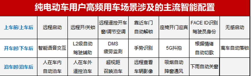 事实上,真正的智能化不应该是技术的堆叠或是拼凑,而是应该站在用户关怀的角度,给用户真正想要的东西,带来更先进、好玩、新潮的科技享受。下面,我们不妨根据一个纯电动车用户最高频的几个用车场景,来看看大概会涉及到哪些实用的智能配置: