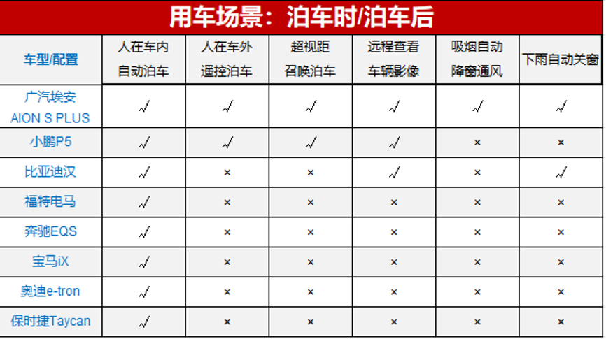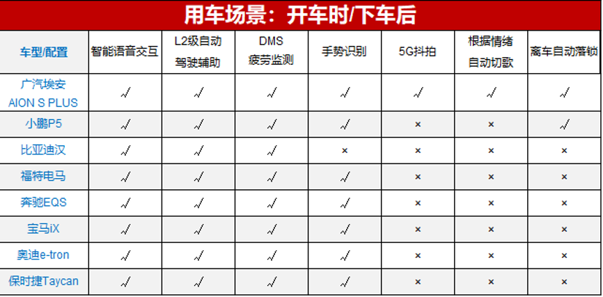 在开车时/下车后的场景中,AION S Plus的表现最令人惊喜。它与小鹏P5共享了1个独有功能,并单独霸占了2个独有功能。
