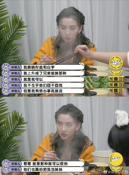 宋祖儿和哥哥姐姐的关系几乎是现实版乔家兄妹,会给白宇P图,发消息轰炸对方,宋祖儿故意做出一个得意的表情:我知道他们烦我,但我不改。