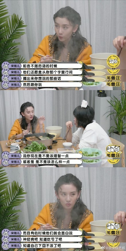 有次主持人问起为什么,宋祖儿开启了毒舌模式:一个嗑瓜子,一个欣赏自己的美貌,一个不知道在那里发呆做什么。