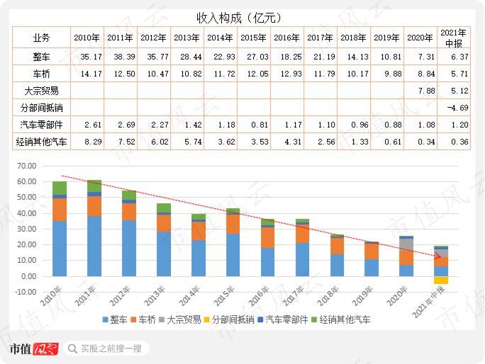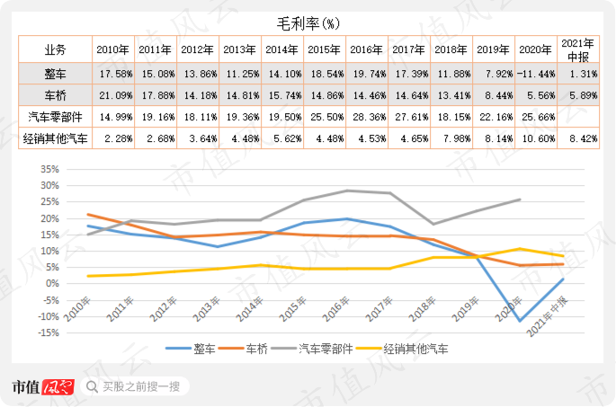 要命的是收入下降的同时,毛利率也降:2010年整车、车桥的毛利率分别为17%、21%,2021年中报分别降至1.3%、5.9%。