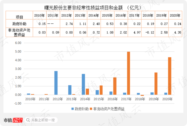 在扣非净利润连续亏损的情况下,曙光股份的净利润仍能录得正值的主要的“功臣”,是政府补助和卖资产:
