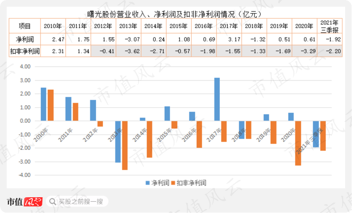 如此情况下,曙光股份交出了扣非净利润连续9年又三个季度亏损的奇葩答卷,2010年至2021年三季度末,扣非净利润累计亏损近16亿元。