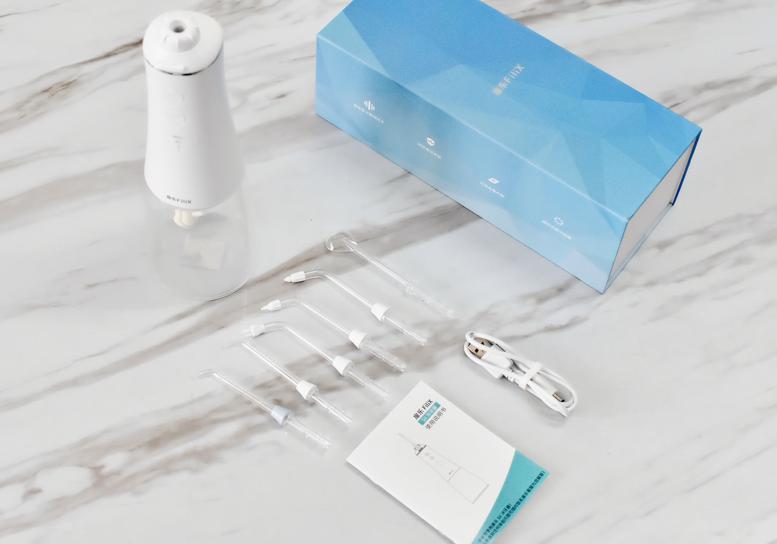 扉乐SII冲牙器的产品和附件采用不同的盒子分类放置,保护非常得体,这一整套产品包括冲牙器、USB充电线、产品使用说明书,另外还有6支不同的喷嘴,齐全的配置一看就相当专业。