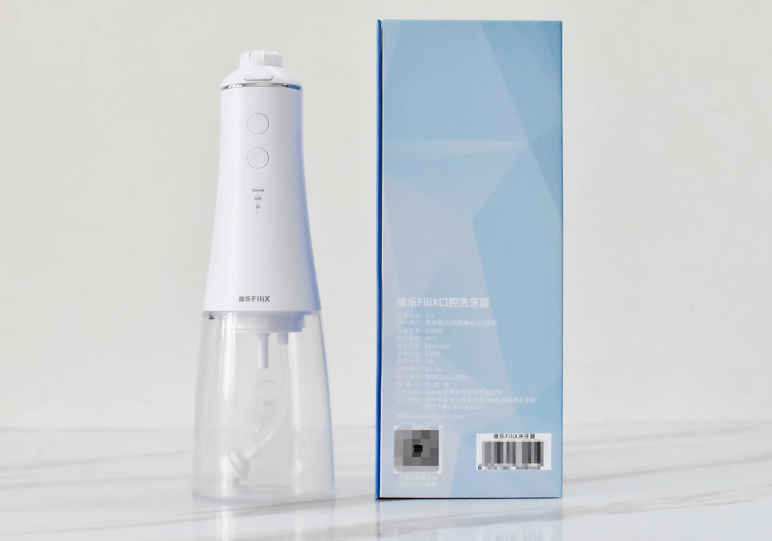 扉乐Sii是扉乐打造的第一款“全场景、多敏式、高精度”冲牙器系列,产品外形看上去有点像一款精致的水杯。通过包装盒背面的介绍可以大致了解到产品的配置与厂商信息,三种工作模式、350ml水箱容量、IPX7防水等级、1800mAh大容量电池等都能为产品的适用性打下了基础,不过更多的核心优势只有在体验中才能完整凸显出来。