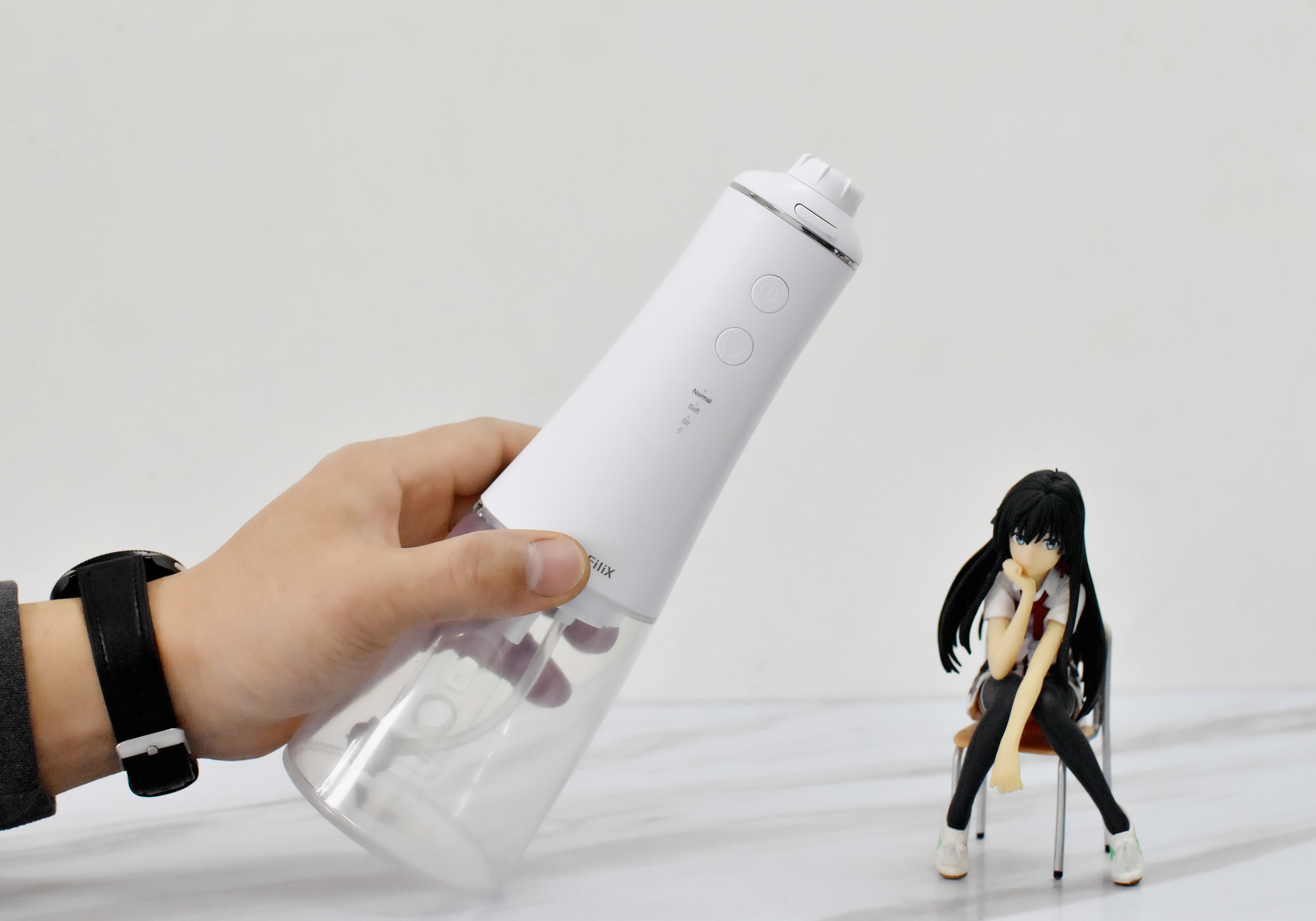冲牙器采用主机和水箱可拆卸的结构设计,机身部分纤细的流线造型非常方便握持,透明水箱的水箱在使用过程中肉眼就能观察到水位的变化,外观设计非常讨喜。