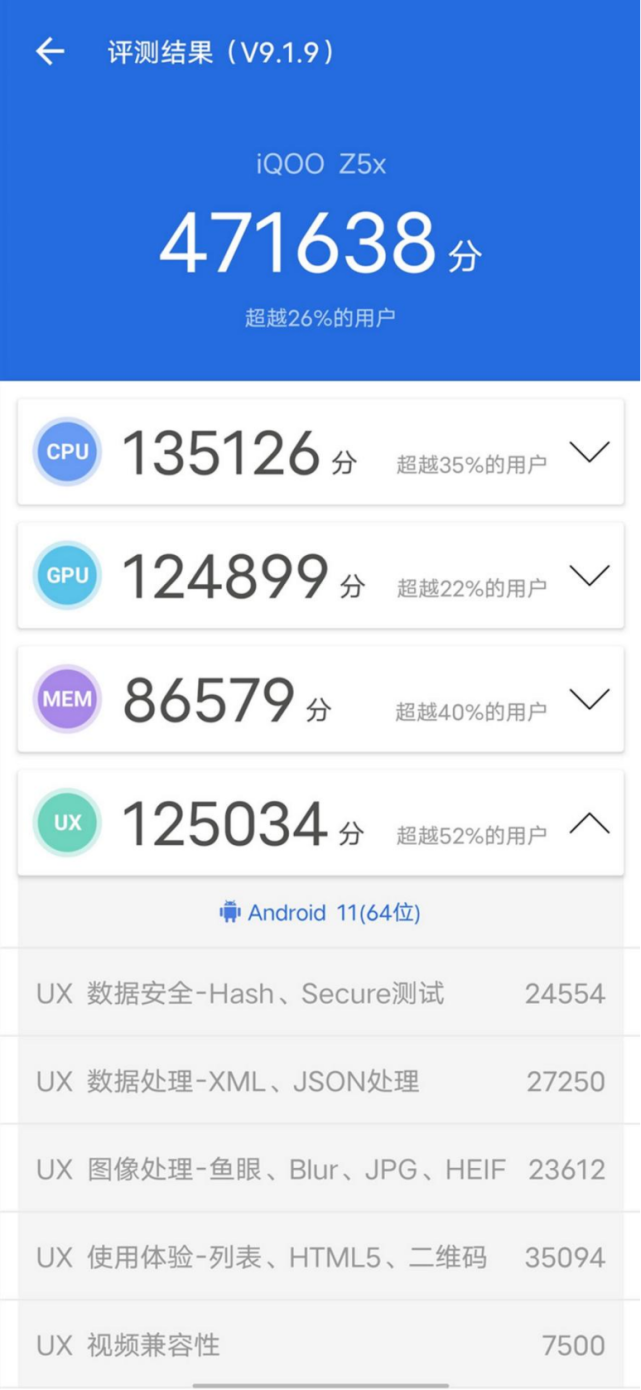 首先在核心硬件方面,天玑900处理配合同价位主流的LPDDR4X+UFS 2.1运存组合还是可圈可点的。据根据安兔兔跑分测试,iQOO Z5x的各项成绩并无掉队现象发生,综合跑分能接近50万。同时在“五重液冷散热系统”的加持下,手机的整体温控也较为令人满意,长时间使用下来也只是散发出正常的温热,不一会儿就自然回归本来的温度了。