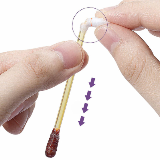 顺利取出碘伏消毒液棉棒后,将彩条端向上,另一头棉签头朝下,轻轻折断带有彩条棉签的一端,随后棉棒里的碘伏消毒液会从彩条端迅速流入另一端的棉签头处,1-2秒的时间,不带彩条的棉签头就被碘伏消毒液迅速浸湿,碘伏消毒液充满整个棉签头。