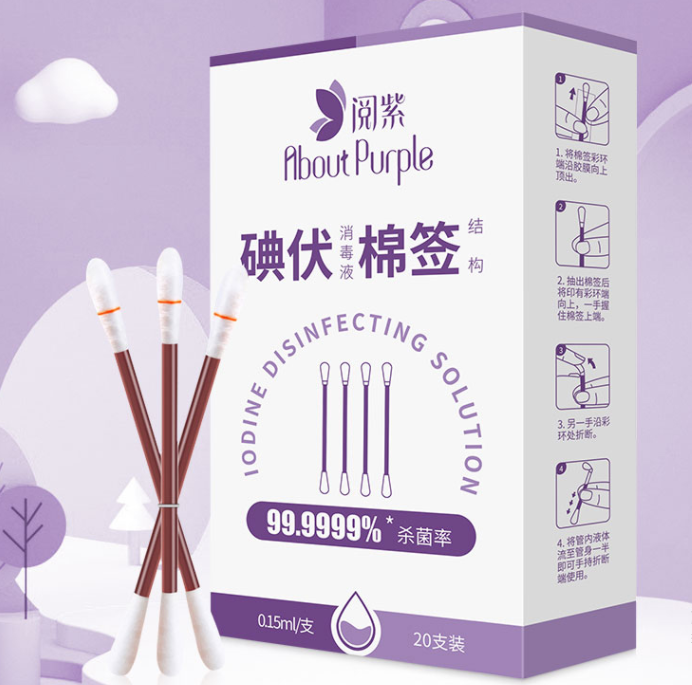使用时首先打开一只碘伏消毒液棉签,看到棉棒有彩环端的一端,沿包装轻轻向上顶出。