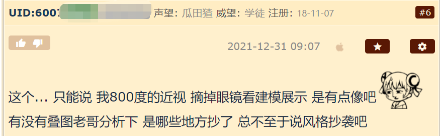 也有网友认为如果拿建模的角度和宣传画相比,根本就没有任何可比性,空口鉴“抄袭”的言论压根站不住脚。
