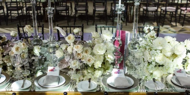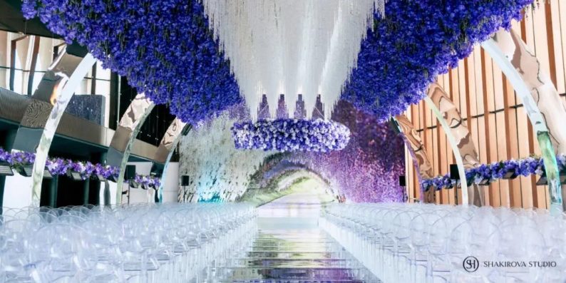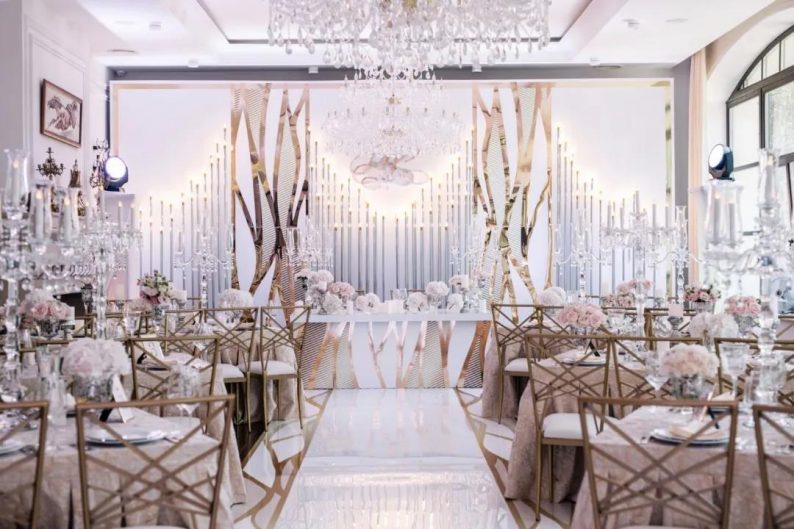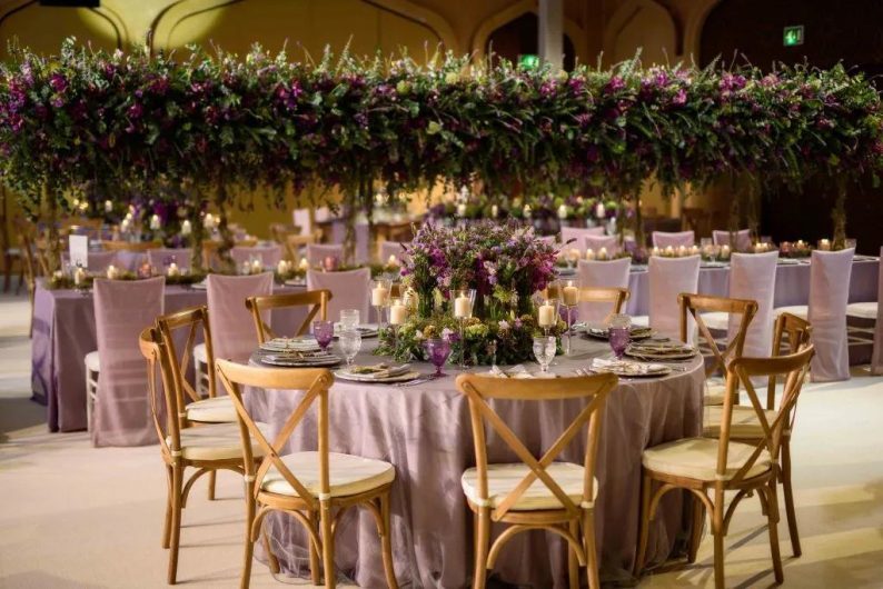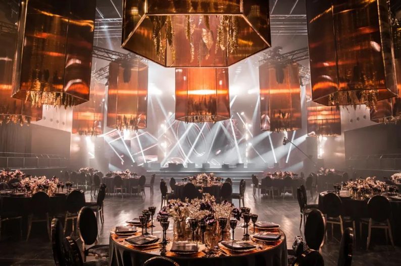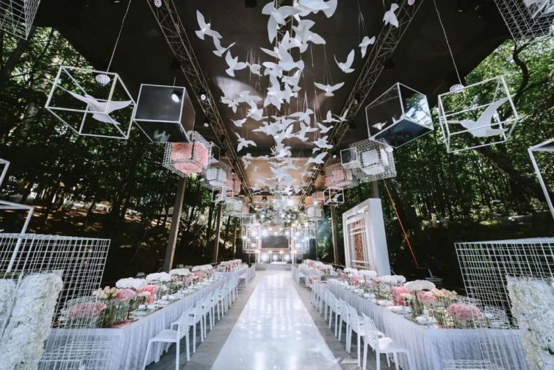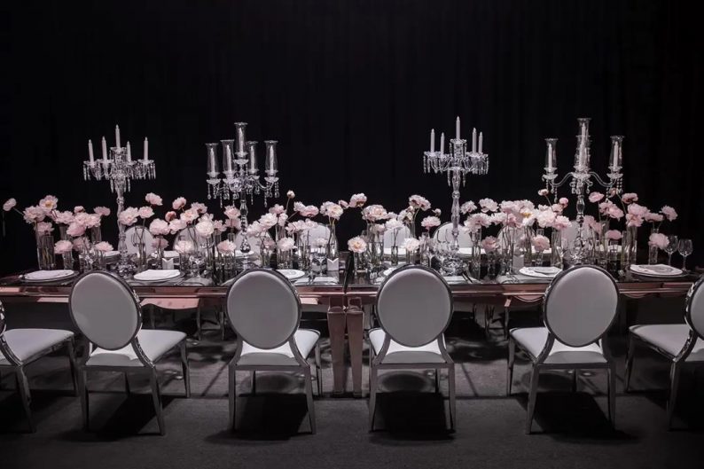 这样的装饰可以将原本宴会厅的模样完全覆盖,更进一步地凸显主题,在灯光和道具的配合下,又进行了一层包装,使得多重感官都能感受到现场的独特与唯美。