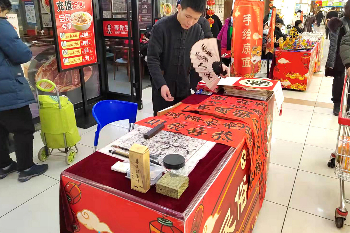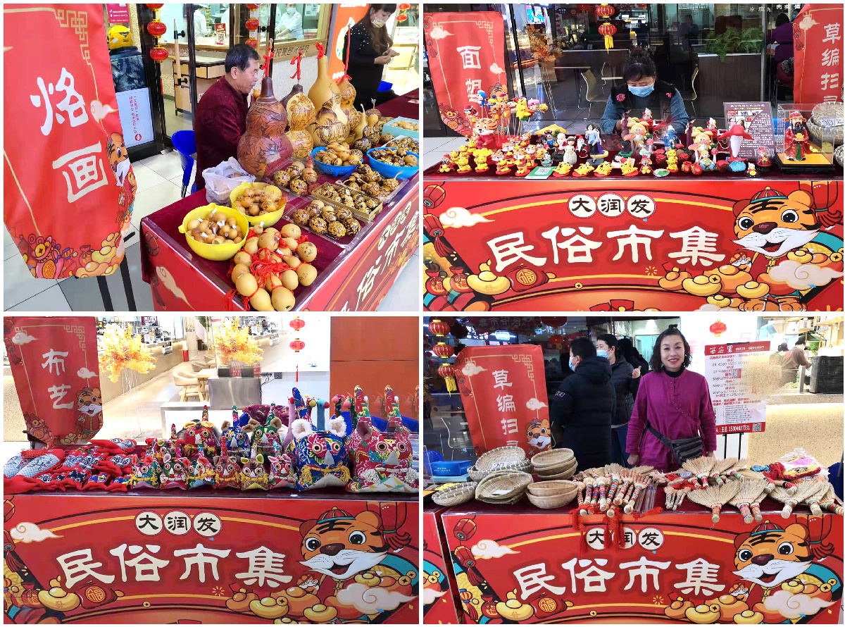 大润发和平店开门红为各位顾客准备了弘扬民俗文化的“民俗市集”,邀请了十多位民间艺术家,现场制作糖画、草编、布艺、手编、手绘扇面等艺术品。今天的开集仪式邀请了魔术、相声现场表演。真是虎虎生威好兆头,喜气洋洋过新年!