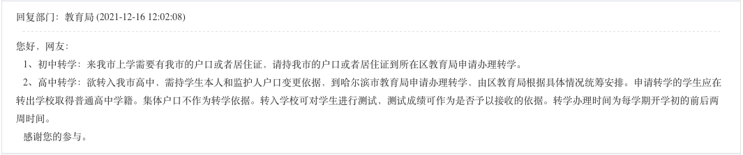 最近,有家长留言咨询外地学籍初高中学生转学至哈尔滨市读书都需要什么流程?