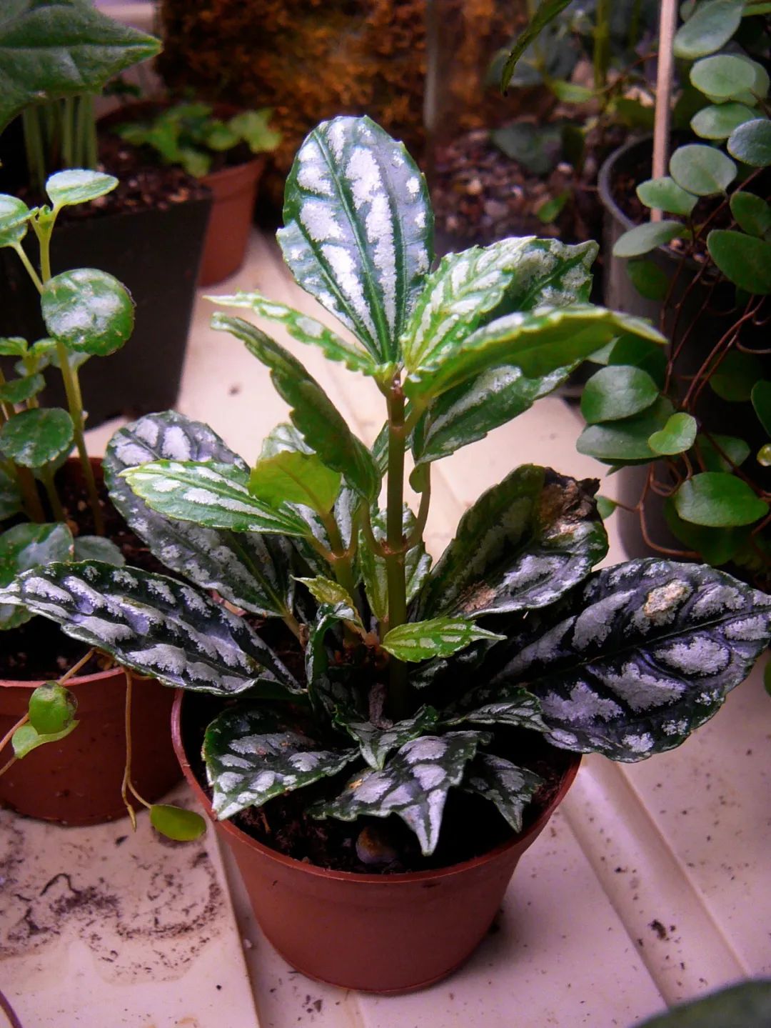 最吸引人的冷水花品种就是“花叶冷水花”,还有皱叶冷水花等,它有着靓丽的叶子,叶面上会有银白色和绿色相间的斑纹,叶面上凸起来的部分就是银白色的,有点像金属的光泽,看起来非常精致迷人。