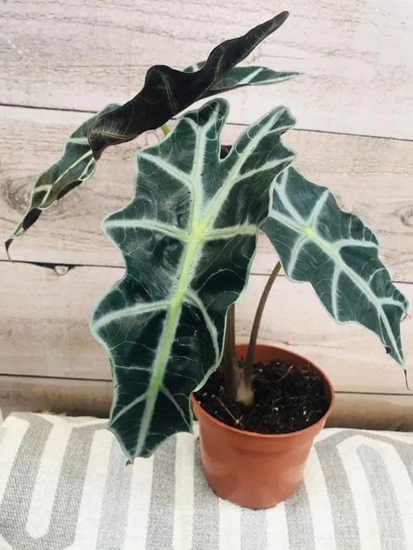 黑叶观音莲是杂交培育出来的观叶植物,它的叶子是非常具有识别性的,它在叶脉是米白色的,而叶片则是呈现墨绿色的状态,整片叶子的形态是箭头型的。