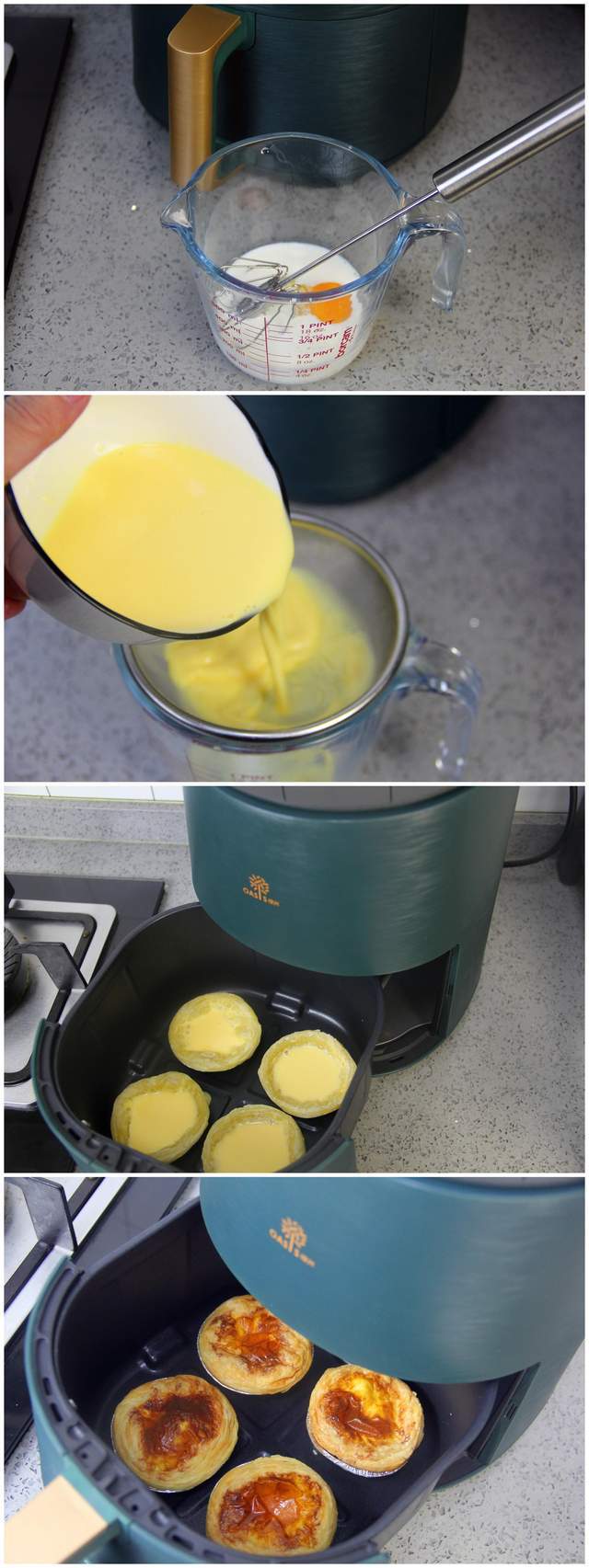 最后来尝试我最爱的甜品蛋挞。打一个生鸡蛋加入80g鲜牛奶,一勺白糖,有条件的可以加入一点炼乳味道更佳。搅拌均匀后用滤网过滤一下保证口感细腻。倒入事先购买好的蛋挞皮,8分满即可。喜欢吃酥酥脆脆口感的朋友可以先将蛋挞皮放入空气炸锅预热3分钟。选择利仁空气炸锅蛋挞档位,180℃预设温度,10分钟后香气腾腾的自制蛋挞就出锅了。日常肯德基8元/个的蛋挞,使用利仁空气炸锅在家自制成本2元不到,终于实现蛋挞自由了!