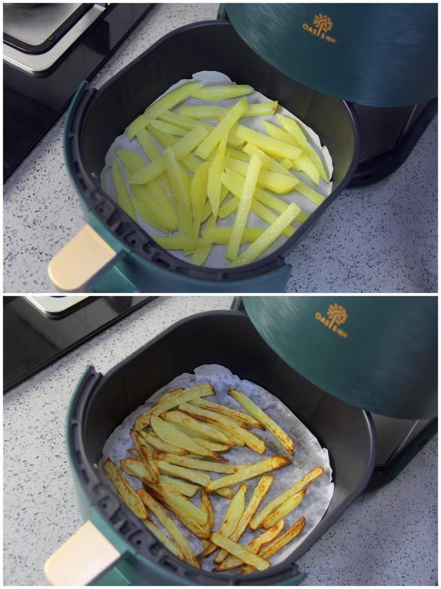 取黄金土豆洗净去皮切条,清水浸泡洗净表面淀粉,小火下锅焯水一分钟断生,捞起用厨房纸吸干土豆条表面的水分,加少许食用油和实验抓匀后就可以入空气炸锅了。选择薯条档位,默认温度200℃,经过15分钟就可以完成一次自制炸薯条,建议中途每隔5分钟抽出烤篮查看成色并翻动一次。又香又脆还非油炸,十分健康。
