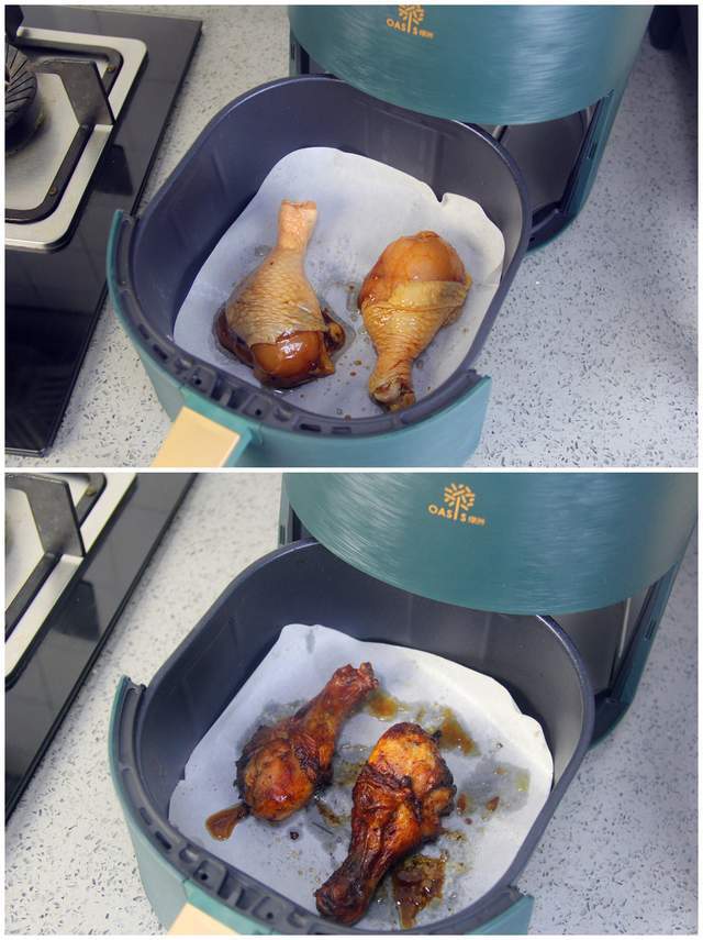 接下来试试肉肉,选大鸡腿两只,先腌制入味后放入空气炸锅,选择鸡腿档位,200℃预设温度,翻面烤炸20分钟完成。由于是肉类,建议中途及时翻面,可以根据成色自行灵活增减时长。
