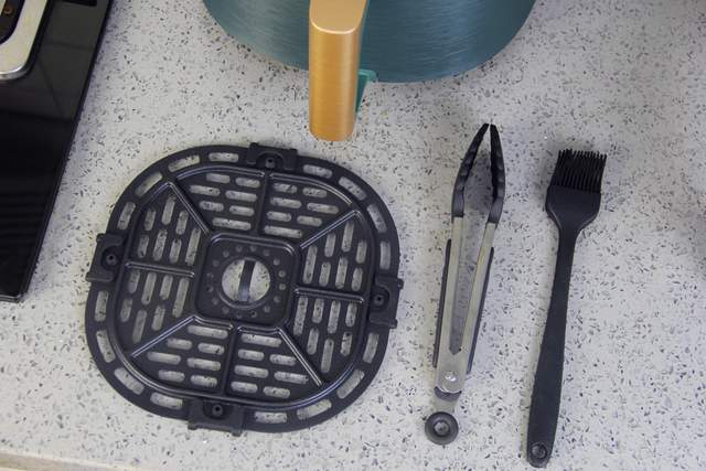 随空气炸锅标配的还有可拆卸式烤盘、不锈钢硅胶夹和硅胶油刷,都是食品级安全材质,可放心使用。