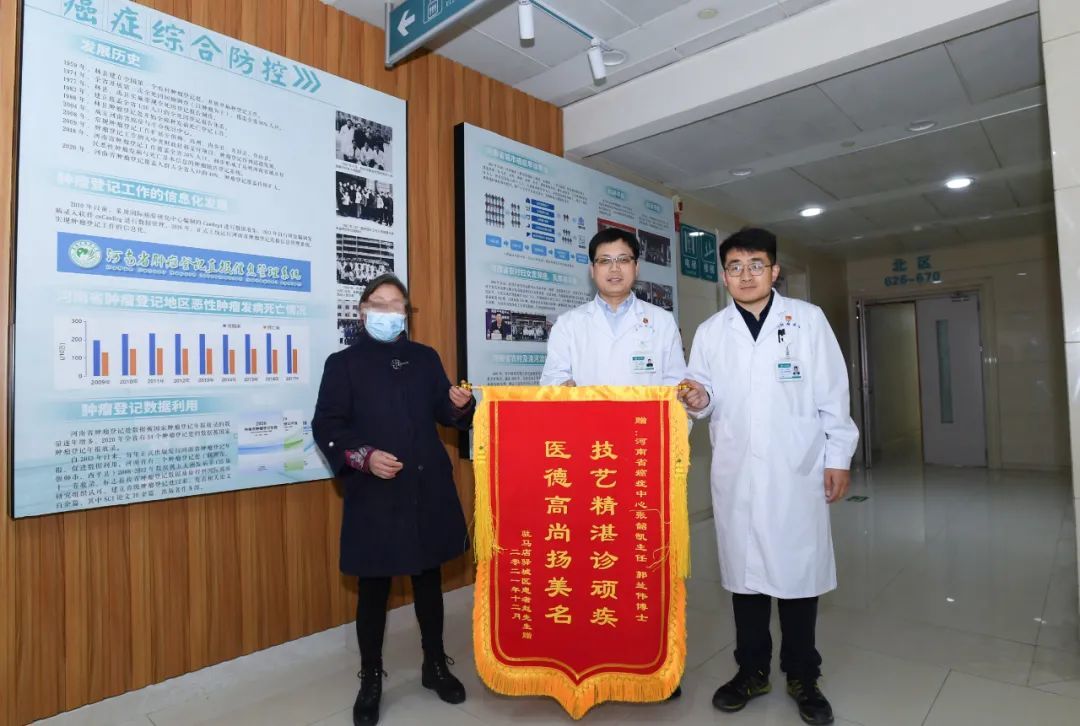 2021年12月31日,家住驻马店市驿城区的张女士来到河南省肿瘤医院,为表达谢意,将一面红彤彤的锦旗送给了河南省肿瘤医院疾病预防控制办公室主任张韶凯和郭兰伟博士。