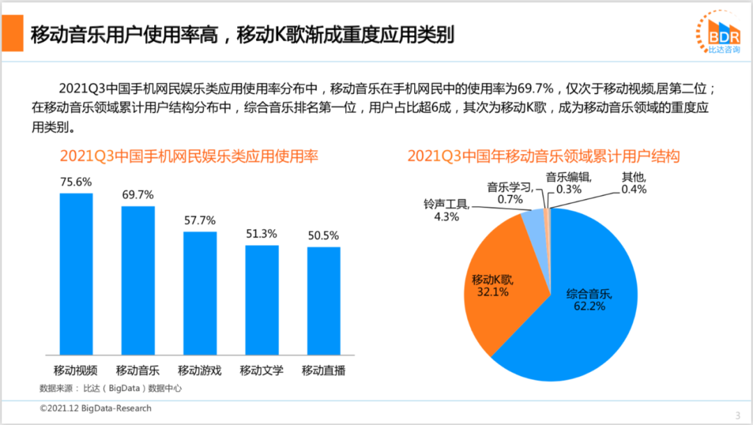 · 12月30日,据比达咨询发布的《2021第三季度中国移动K歌产品市场研究报告》显示,2021Q3中国手机网民娱乐类应用使用率分布中,移动音乐在手机网民中的使用率为69.7%,仅次于移动视频,居第二位;在移动音乐领域累计用户结构分布中,综合音乐排名第一位,用户占比超6成,其次为移动K歌,成为移动音乐领域的重度应用类别。