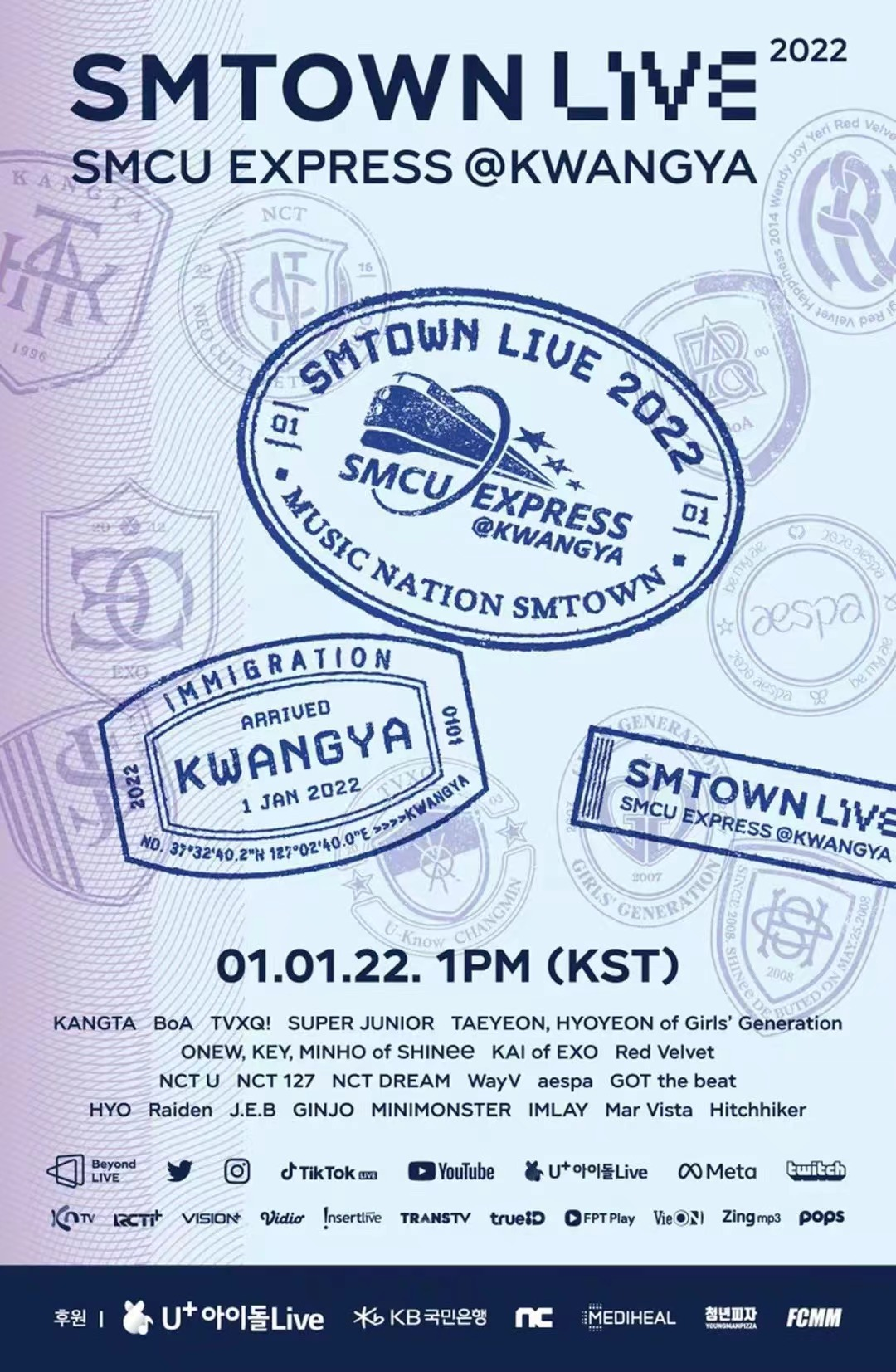 “SMTOWN LIVE 2022 : SMCU EXPRESS@KWANGYA”于2022年1月1日中午12点(北京时间)举办,活动以“SMCU EXPRESS STATION”为背景,可以观看到安七炫、BoA、东方神起、SUPER JUNIOR、少女时代成员太妍、孝渊以及SHINee成员温流、KEY、珉豪和EXO成员KAI、Red Velvet、NCT U、NCT 127、NCT DREAM、威神V(WayV)、aespa、GOT the beat、Raiden、GINJO、IMLAY、J.E.B、MINIMONSTER、Mar Vista、Hitchhiker等特级艺人们与众不同的舞台。