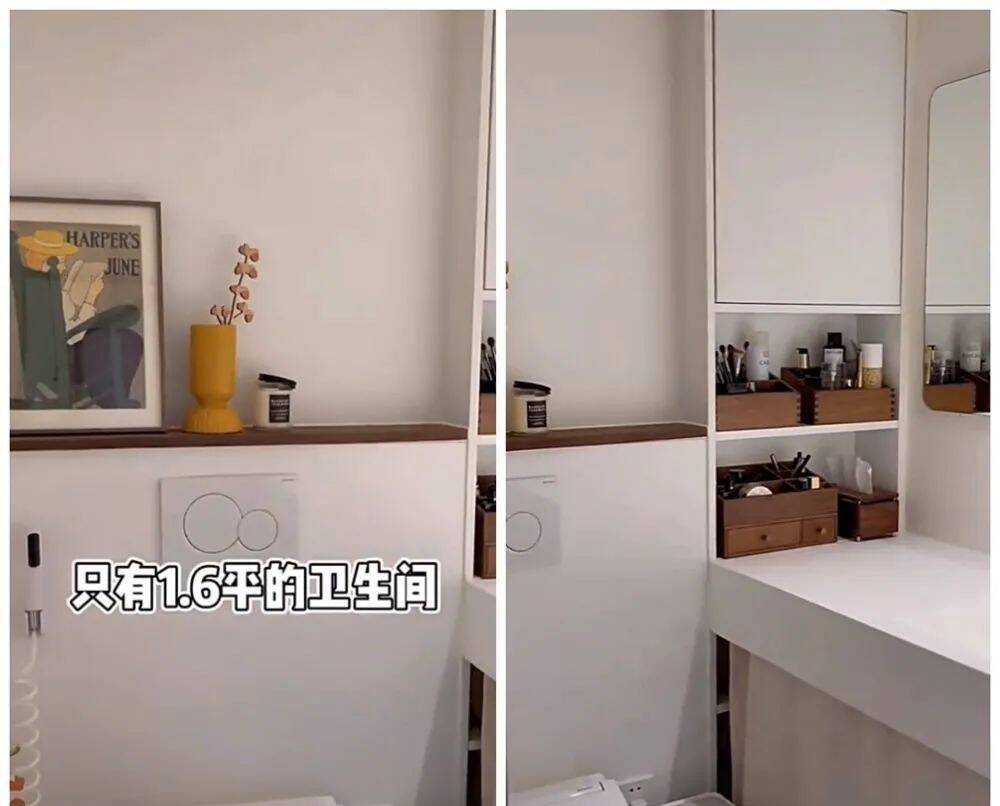 原本的卫生间不设干湿分区,但重新设计之后,卫生间被单独隔断出来,马桶放在了一个1.6㎡的空间内;同时,洗手池也被安置在了这里。