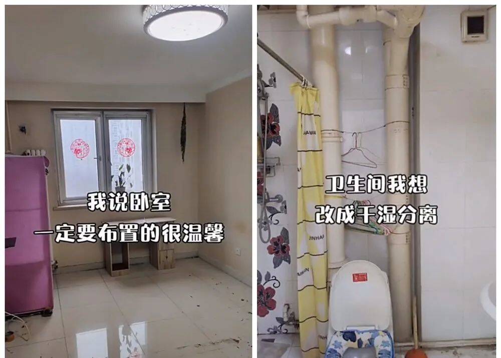 此外,卧室、卫生间等空间内,装修设计也非常老旧与过时,不仅采光和照明都很差,同时空间格局也不合理,尤其是卫生间,甚至连干湿分离都没做。