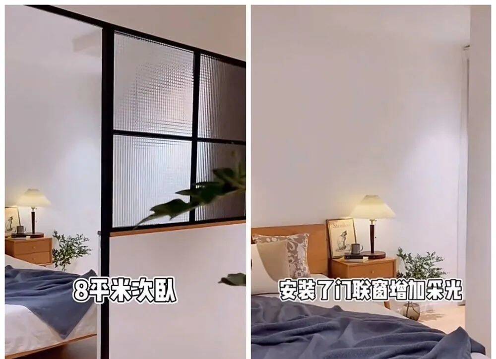次卧则是新隔断出的空间,利用半透明的玻璃窗,满足隐私和采光的双重需求。
