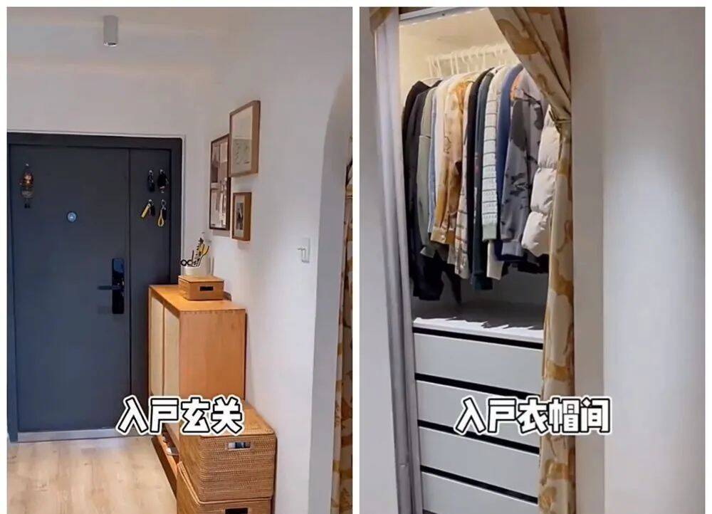 而原本一进门的超大开放式空间,被重新隔断开,左手边变成了一个单独的衣帽间,既能提供日常的衣物收纳功能,又可以当作进入家中时的换衣柜。