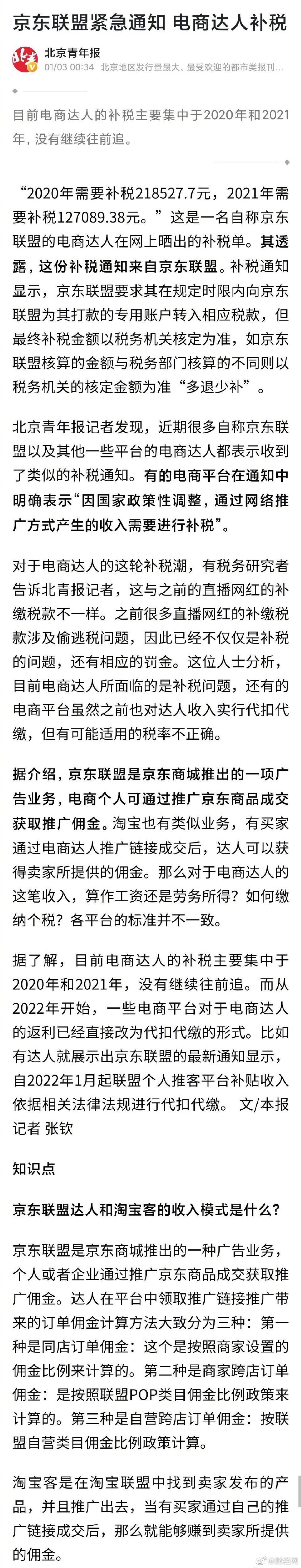 【#京东联盟紧急通知电商达人补税#】 据了解,目前电商达人的补税主要集中于2020年和2021年,没有继续往前追。而从2022年开始,一些电商平台对于电商达人的返利已经直接改为代扣代缴的形式。比如有达人就展示出京东联盟的最新通知显示,自2022年1月起联盟个人推客平台补贴收入依据相关法律法规进行代扣代缴。(北京青年报)
