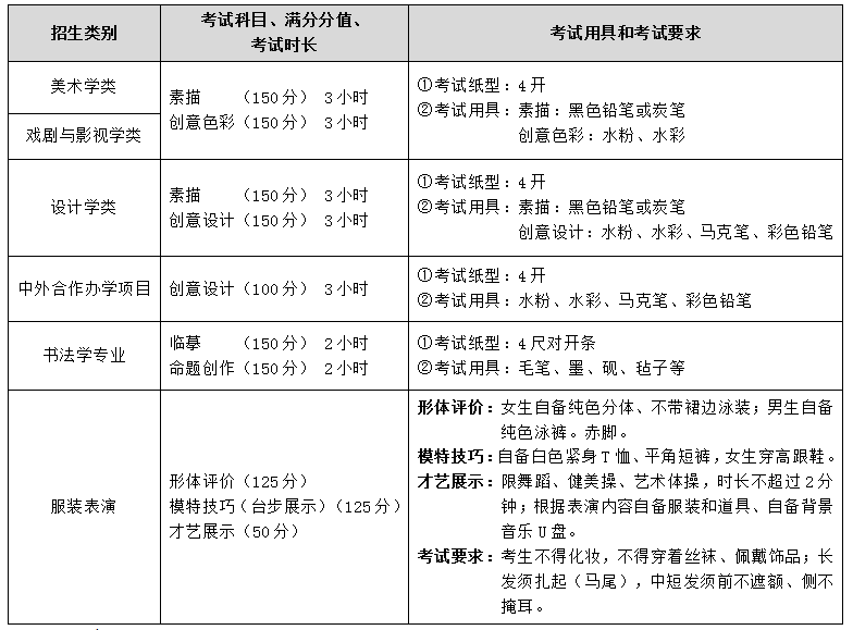 1、考生只能在美术学类、戏剧与影视学类、设计学类、中外合作办学项目、书法学专业、服装表演中选择一类报考,不能兼报。