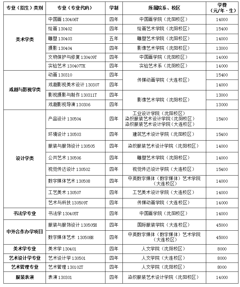 学校是辽宁省重点支持的国内一流大学建设单位,中国画、绘画、雕塑、产品设计、视觉传达设计、动画、摄影、环境设计、服装与服饰设计、工艺美术专业被评为国家级一流本科专业建设点;数字媒体艺术专业被评为省级一流本科专业建设点。学校与国际上30余所艺术院校建立了友好校际关系,并经教育部批准,分别与日本文化学园文化服装学院、英国索尔福德大学开展合作办学。