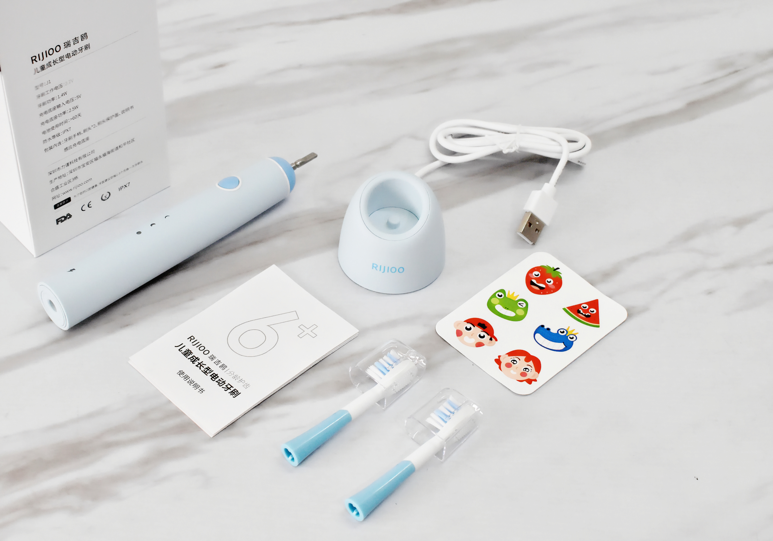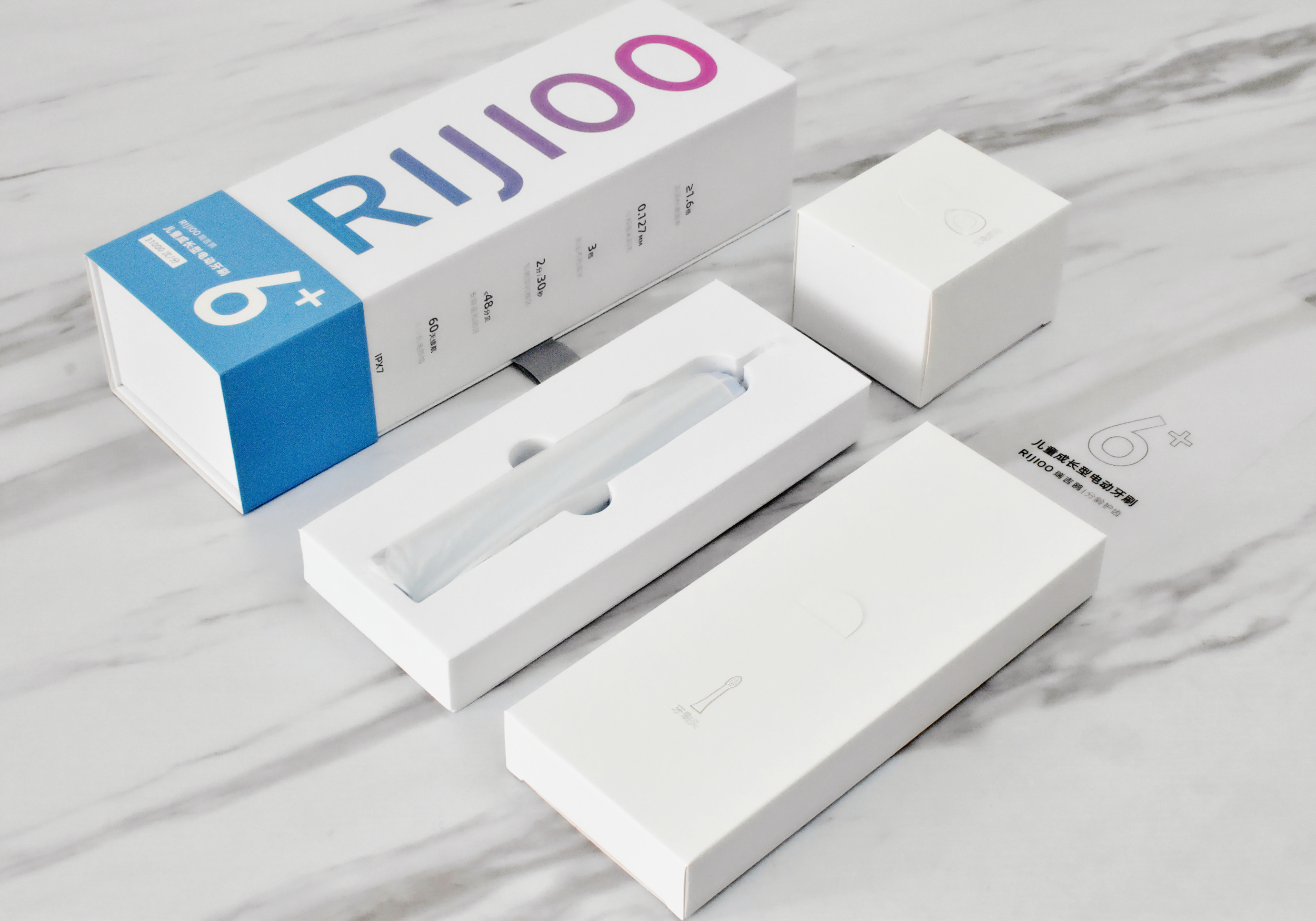 通过咨询和了解RIJIOO瑞吉鸥将儿童电动牙刷目前主要针对两个分龄护齿阶段,也就是3+和6+两个系列的产品,分别为3-6岁乳牙期和6-12岁换牙期制定的儿童电动牙刷,有浅蓝色和粉红色两种配色可选,所以根据孩子的年龄阶段选择了6+蓝。