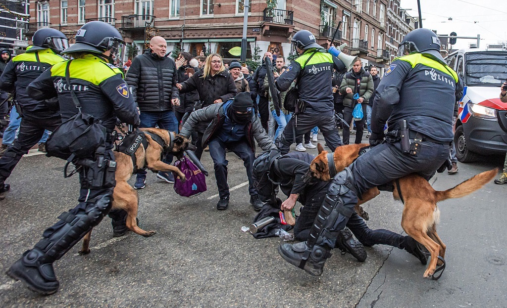 当地时间2022年1月2日,荷兰阿姆斯特丹,数千名示威者聚集在市中心的博物馆广场附近,举行反对政府防疫政策的示威行动。警方持盾赶到现场并与示威者发生冲突。警方还放出警犬撕咬示威者。