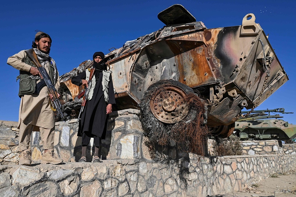 当地时间2021年11月13日,阿富汗加慈尼,当地举行庆祝塔利班胜利的非正式展览,被摧毁的锈迹斑斑的美国装甲车辆的残骸被展示在这里。
