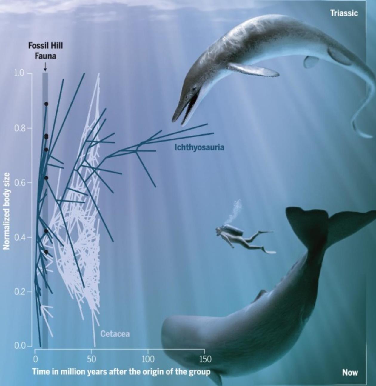 不过,令科学家疑惑的是,它是如何迅速达到这个尺寸的。对此,该研究给出的解释是,这要归功于猎物的大量出现。大约600万年前,地球在二叠纪三叠纪边界经历了有史以来最严重的灭绝事件。当鱼龙出现的时候,许多生态空白已经被鱼类、乌贼、菊石类和被称为牙形虫的动物所填补,这些新的丰富猎物可能支撑了像鱼龙这样捕食者物种的快速增长。