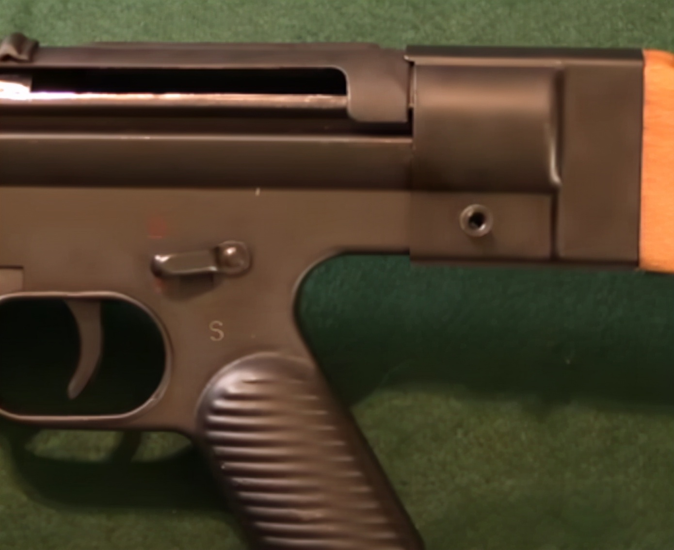 这把枪也是具备防尘盖的,只不过这把枪和当时很多自由枪机的冲锋枪一样,防尘盖覆盖了整个机匣顶部,相对较麻烦。而STG44的防尘盖则是类似于AR15的防尘盖,要比STG45方便简洁的多。