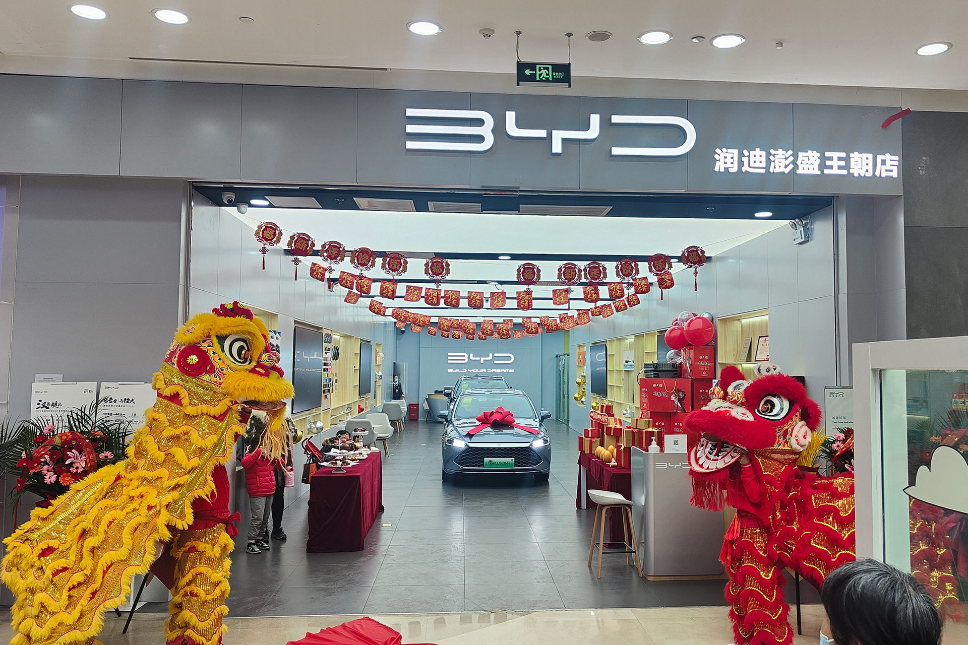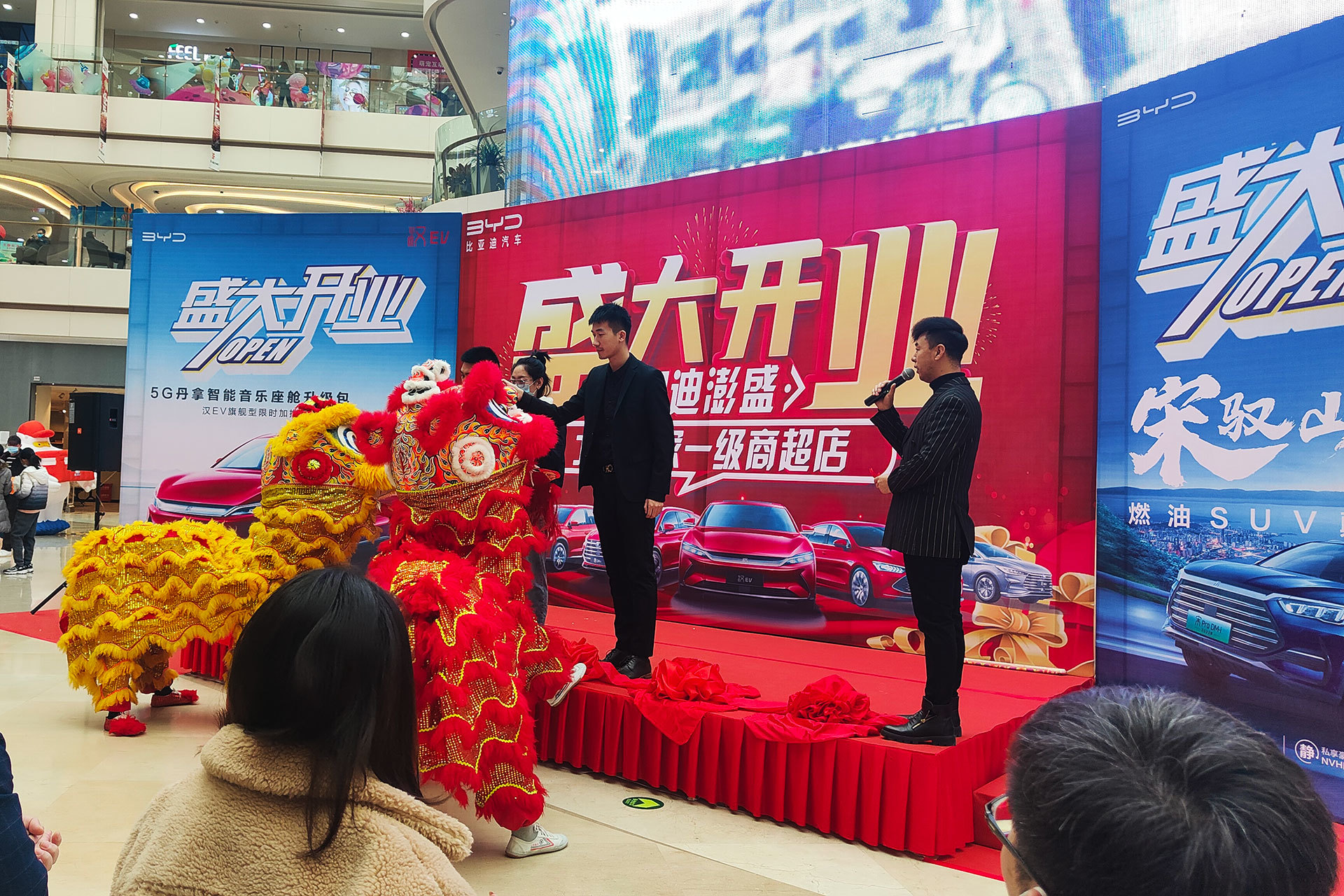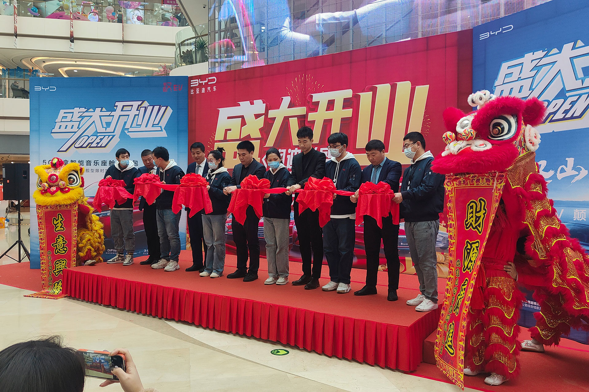 临近庆典活动尾声,参加活动的相关领导和润迪澎盛王朝店员工一起举行了剪彩仪式,由双狮带领现场围观的消费者去往店面,双狮为润迪澎盛王朝店揭幕,至此,比亚迪汽车北京首家一级商超店-润迪澎盛王朝店正式对外营业,开业现场关注比亚迪的消费者摩肩接踵,络绎不绝。