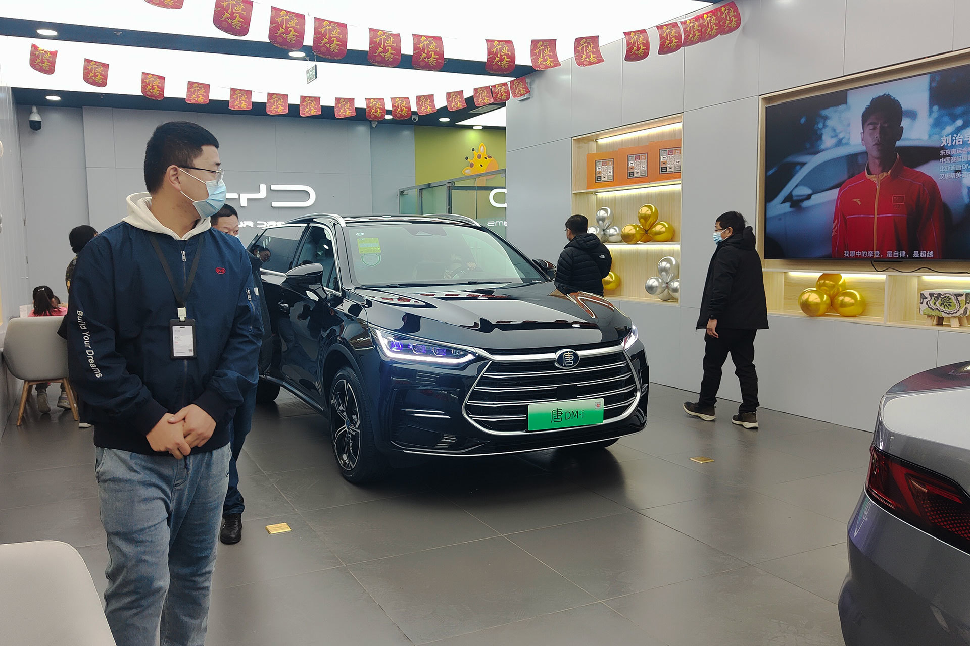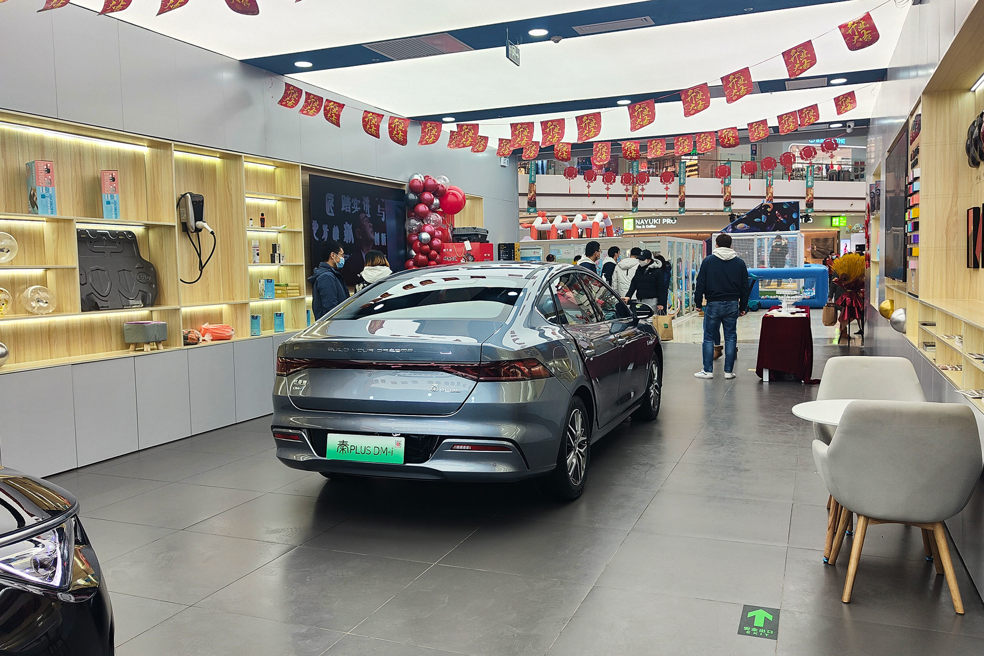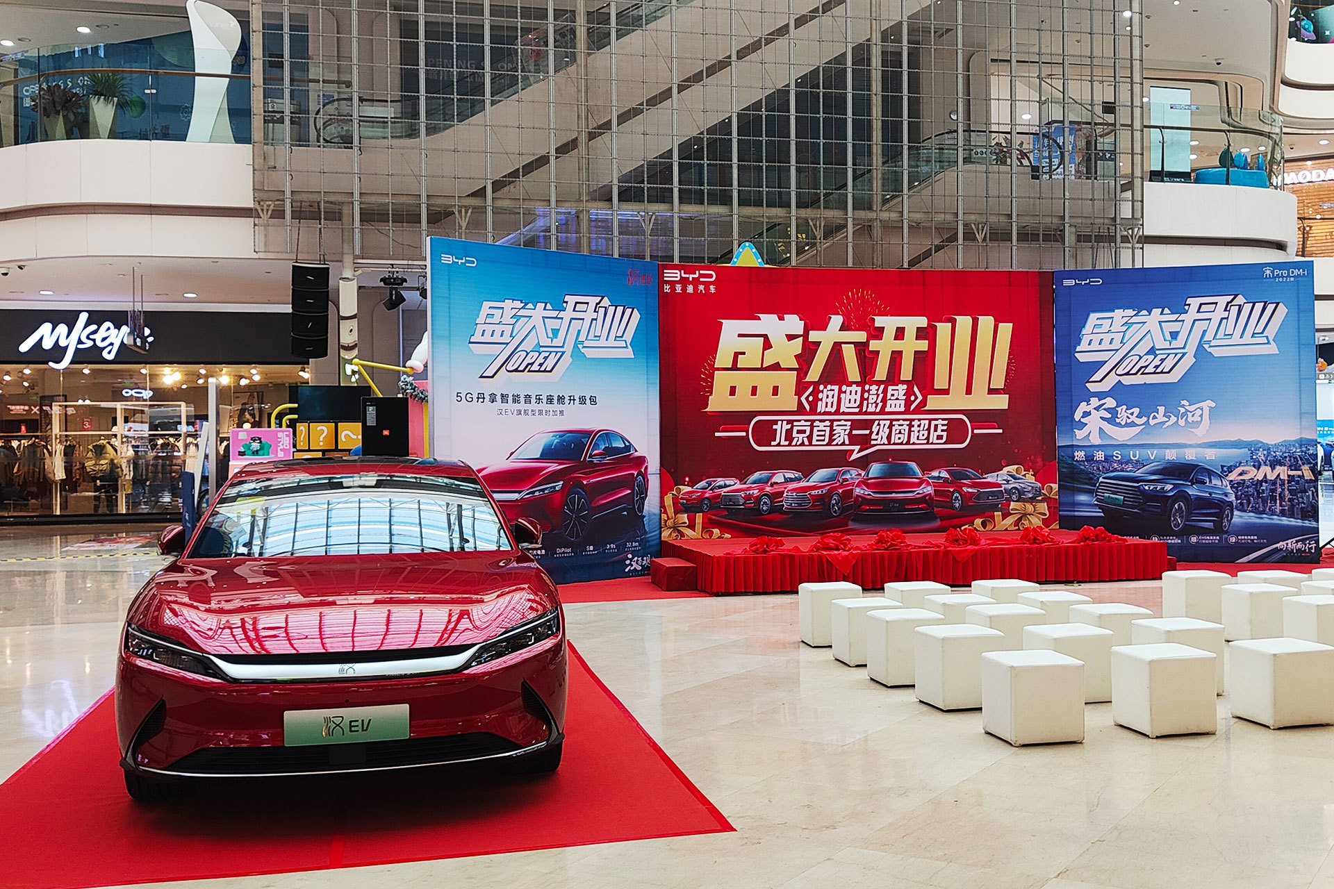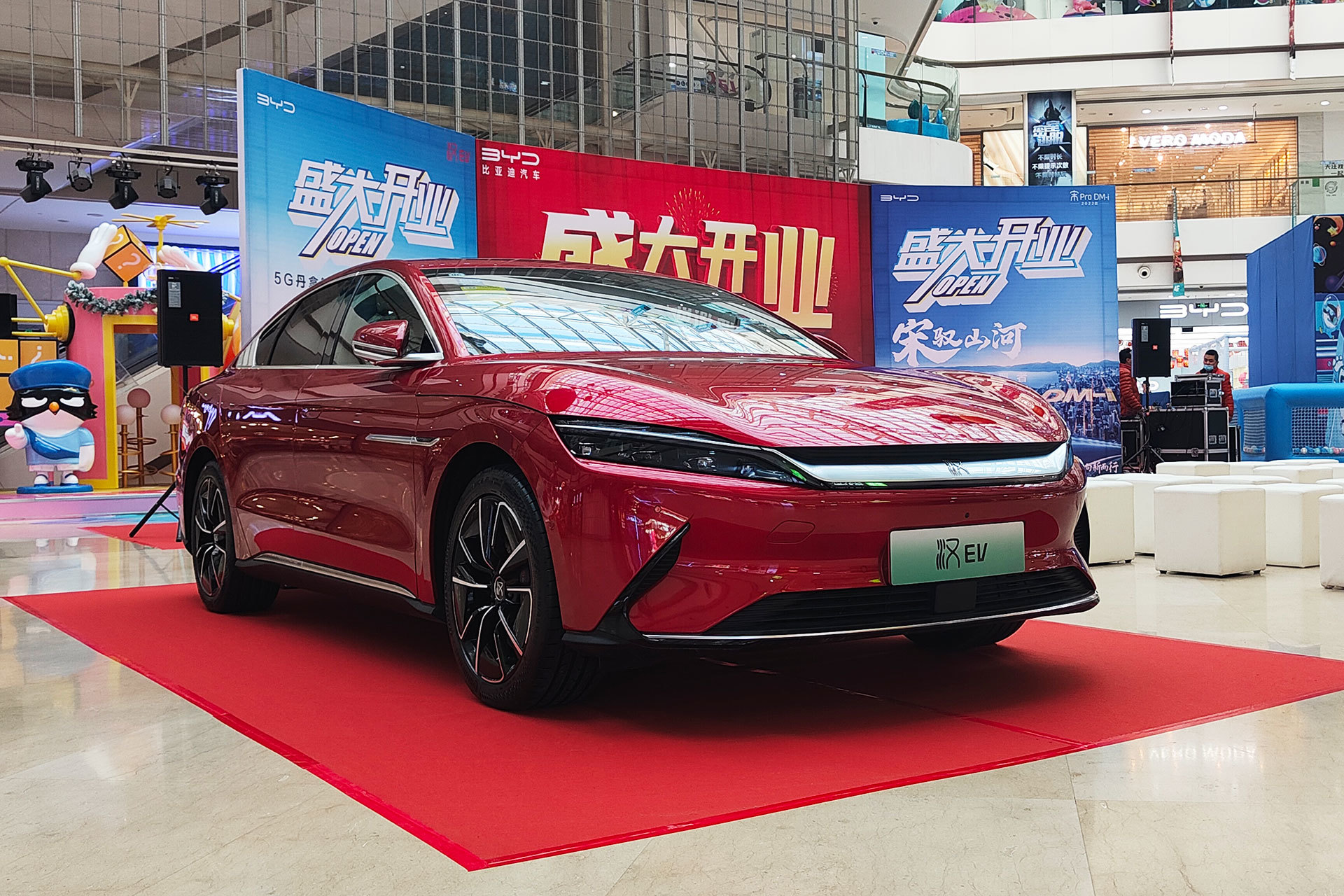 润迪澎盛王朝店主营比亚迪旗下王朝系列车型,开业庆典活动现场摆放了一辆汉EV豪华轿车,2021年11月,比亚迪汉月销量高达12841辆,其中汉EV版本销量高达10021辆,汉EV也成了国内首辆单月销量破万的纯电中大型轿车。