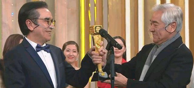 为他颁奖的是狄龙与姜大卫哥哥秦沛,这真是整晚最动人的时刻。