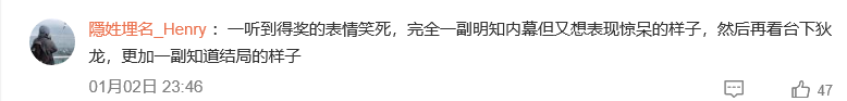 谭俊彦得奖时的反应也被网友吐槽了:“完全一副明知内幕但又想表现惊呆的样子,然后再看台下狄龙,更加一副知道结局的样子”。
